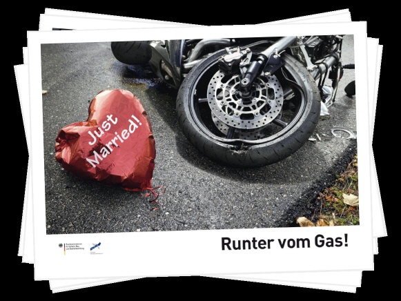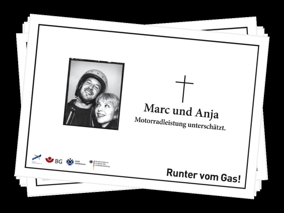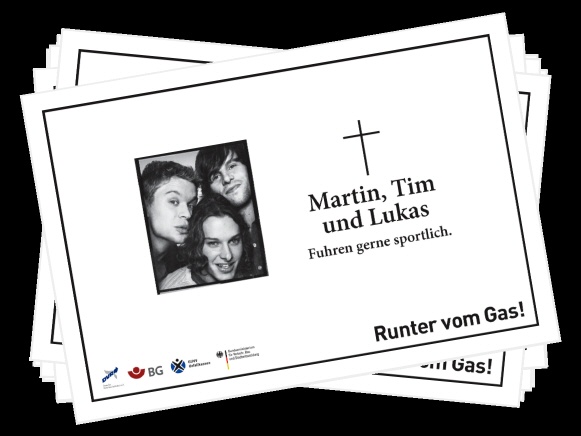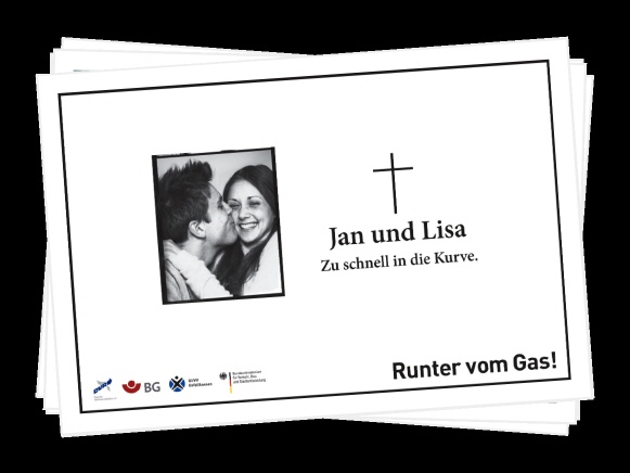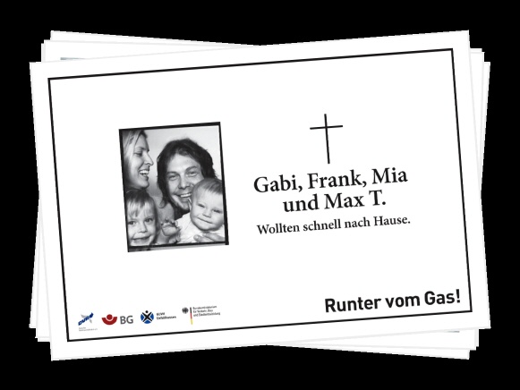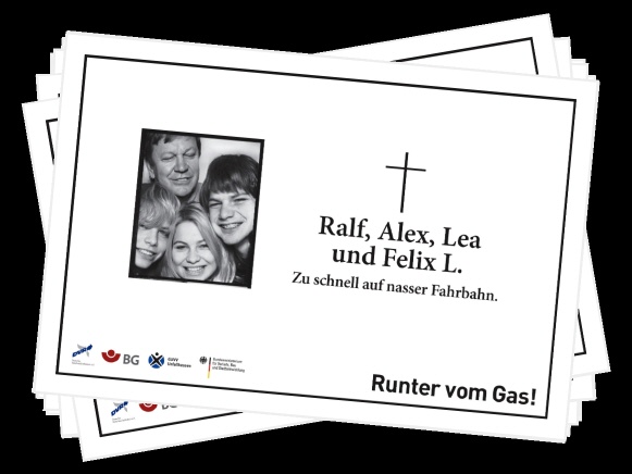 Mit Unterstützung der Deutschen Gesetzlichen Unfallversicherung (DGUV) erinnerten Plakatmotive entlang der Autobahnen mit fiktiven Todesanzeigen oder nachgestellten Unfallszenen und Bildern von Hinterbliebenen eindringlich an die drastischen Folgen überhöhter Geschwindigkeit. Ebenso sprachen TV-, Kino- und Radiospots die Verkehrsteilnehmer emotional an und verdeutlichten, dass jeder Verkehrsteilnehmer durch verantwortungsbewusstes Verhalten dazu beitragen kann, schwerwiegende Unfälle zu vermeiden. Schauspieler Wolfgang Fierek und Motorrad-Profi Katja Poensgen gaben in der Videoreihe „Fiereks Werkstatt“ wertvolle Tipps für sicheres Motorradfahren. In Videopodcasts berichteten junge Fahrer von persönlichen Unfallerlebnissen und auch Angehörige tödlich verletzter Verkehrsteilnehmer kamen zu Wort. Prominente Unterstützung erhielt die Kampagne z.B. auch von Model und Moderatorin Lena Gercke, Schauspielerin Anne-Sophie Briest und Tagesschausprecher Jan Hofer sowie vielen anderen Prominenten.