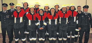 (zir) Neun Feuerwehrmänner und zwei Frauen nahmen erfolgreich an der Leistungsprüfung der Schönauer Wehr teil. Aufmerksame Schiedsrichter waren Kreisjugendwart Hans-Peter Schonder aus Bischofsheim (rechts) und von links der Unterelsbacher Kommandant, Christoph Hergenhan, sowie Kreisbrandmeister Michael Omert (Oberelsbach). Das Bild zeigt (weiter von links): Tobias Eifert (Goldgrün), Alexander Kess (Goldgrün), Dennis Rehm (Gold), Benedikt Märkert (Bronze), Jessica Johannes (Silber), Simon Griebel (Goldrot), Diana Zirkelbach (Gold), Philipp Vey (Silber), Volker Zirkelbach (Goldrot), Julian Fries, (Bronze), Udo Vorndran (Silber) und Kommandant Ewald Johannes.