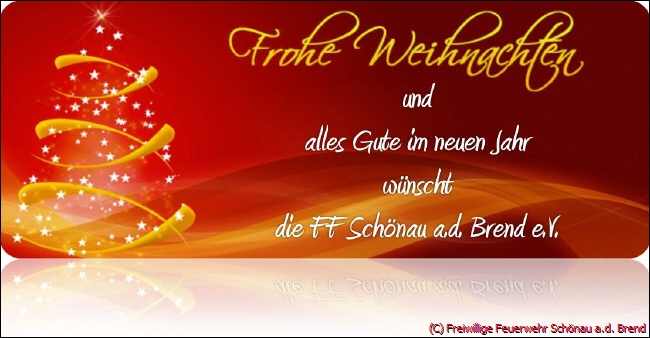 Die Freiwillige Feuerwehr Schönau a.d. Brend e.V. wünscht Ihren Mitgliedern sowie der gesamten Dorfbevölkerung ein frohes Weihnachtsfest und ein gutes und gefahrloses Jahr 2015. |