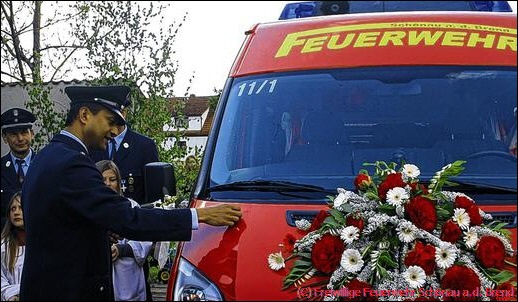 Bei einem festlichen Gottesdienst im Bauhof segnete Vikar Pater Augustin in schmucker Feuerwehruniform das neue Fahrzeug und die Räume. Gemeinschaft praktizieren sei eine besondere Eigenschaft der Feuerwehrleute, dies gelte bei allen ihren Einsätzen, ihren Übungen genauso wie beim gemeinsamen Feiern, stellte er den Zusammenhalt und die Kameradschaft innerhalb einer funktionierenden Wehr heraus. Diese Gemeinschaft werde auch im gemeinsamen Gottesdienst deutlich in den Vordergrund gestellt, denn hier könne die Kraft für den Einsatz gesammelt werden. Ein gemeinsamer Gottesdienst strahle auf den Auftrag der Feuerwehr aus, bekräftige das Verantwortungsbewusstsein und stärke Gelassenheit und Ruhe, welche Voraussetzungen für die Sicherheit eines Einsatzes seien.