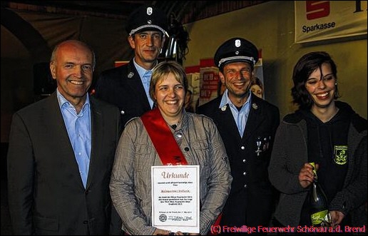 Miss mit Urkunde: Zum 2. Mal wurde der Titel der Miss Feuerwehr Rhön-Grabfeld vergeben. Unter sieben Kandidatinnen siegte Stefanie Weingärtner (Mitte) aus Langenleiten. Es gratulierten (von links) Landrat Thomas Habermann, Alexander Keß, Vorsitzender des Feuerwehrvereins Schönau, Ewald Johannes, 1. Kommandant und die Zweitplatzierte des Wettbewerbs Mareike Pfister aus Lebenhan. Foto: Zirkelbach