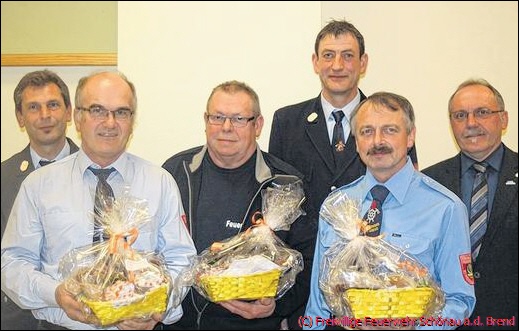 Für 40-jährige treue Mitgliedschaft im Feuerwehrverein Schönau wurden mit Urkunde und einem Geschenk geehrt (vorne von links): Walter Beck, Wilfried Deget, Manfred Rehm. Nicht auf dem Bild Albert Stäblein. Es gratulierten (hinten von links): Kommandant Ewald Johannes, Vorsitzender Alexander Keß und Bürgermeister Rudi Zehe. Foto: Zirkelbach