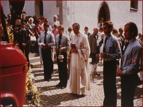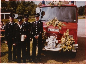 Im Jahr 1981 ging ein lange ersehnter Wunsch der Wehr in Erfüllung. Durch die Gemeinde wurde ein Löschgruppenfahrzeugfahrzeug LF 8 auf Fahrgestell Mercedes Benz, Aufbau Metz, angeschafft. Seinen ersten Ernstfalleinsatz erlebte das Fahrzeug am Montag den 30.01.1982, bei dem die Wehr zu einem Heizraumbrand bei der Firma Türk gerufen wurde. Im Jahre 1981 wurde mit einem Kostenaufwand von 50.000,- DM das heutige Feuerwehrhaus errichtet. An Zuschüssen flossen 26.500 DM. Die Einweihung des LF 8 beging man mit einem gebührendem Fest am 5. u. 6. Juni 1982. Am Samstag fand mit den Nachbarwehren eine Gemeinschaftsübung statt und am Sonntag nach dem Festgottesdienst, erteilte Kuratus P. Schmidt dem Fahrzeug den kirchlichen Segen. Am Nachmittag herrschte am Sportplatz reger Festbetrieb, dessen Erlös der Fahrzeugfinanzierung zufloss.