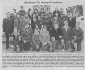 (me) Die Organisation und die Aufgaben der Feuerwehren sowie Fragen zum Jugendschutzgesetz standen im Mittelpunkt des Wissenstests für Feuerwehranwärter. Im Bereich Bischofsheim nahmen Jugendliche aus den Wehren Oberweißenbrunn, Wegfurt, Bischofsheim, Schönau und Burgwallbach teil. Alle Teilnehmer erreichten mehr als die geforderten 50 Prozent an richtigen Antworten. „Die Feuerwehranwärter waren von ihren Jugendwarten und Ausbildern gut auf den Wissenstest vorbereitet“, bemerkte Kreisjugendwart Hans-Peter Schonder. Der Wissenstest findet jährlich während der bayernweiten Feuerwehr-Aktionswoche statt und wird in vier Stufen veranstaltet. Der Wissenstest gilt als Abschluss des Ausbildungsjahres. Bronze erhielten Marcel Göbl, Johannes Patrick, Daniel Keß und Franziska Vey (alle Schönau), Fabian Büttner, Jens Ihde, Marcel Keidel, Janik Weikard, Lorena Keidel und Amelie Kleinhenz (alle Wegfurt). Max Brückmann, Jonathan Kleinhenz, Leon Link und Jonas Schäfer (alle Burgwallbach). André Leiber, Christoph Gundelach, Marcel Tönjann und Lucas Schrenk (alle Oberweißenbrunn). Silber erhielten Stefan Rahm und Philip Vey (beide Schönau), Thomas Hicking (Wegfurt), Christoph Schmitt (Bischofsheim), Patrick Abert (Oberweißenbrunn). Gold erhielten Julia Beck und Jessica Johannes (Schönau), Daniel Gundelach, Alexander Eckert, Julian Eisenmann, Toni Eisenmann, Maximilian Enders und Jacqueline Enders (alle Oberweißenbrunn). Die Urkunde für Stufe vier ging an Felix Stenzel aus Schönau.