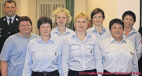 Ihr 25-jähriges Jubiläum kann in diesem Jahr die Damenfeuerwehrgruppe feiern. Alexander Keß lobte für ihren Übungsfleiß: Karola Beck, Theresia Deget, Maria Mangold, Doris Müller, Monika Reubelt, Theresia Stäblein, Jutta Vey und Ingrid Zehe.