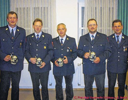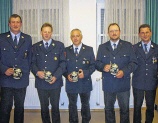Ausgezeichnet: Für 25jährige Dienstzeit wurden bei der Hauptversammlung der Feuerwehr Schönau von Kommandant Ewald Johannes (rechts) geehrt: (weiter von rechts) Bernhard Zirkelbach, Elmar Reubelt, Franz Baumbach und Alexander Kess. Foto: Zirkelbach